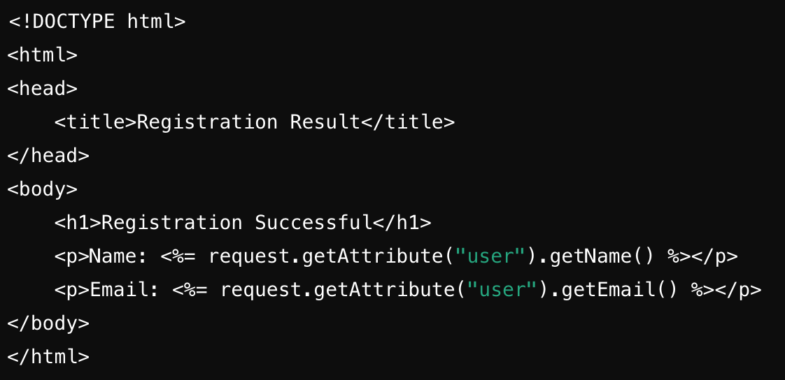 - result.jsp는 사용자에게 등록 성공 메시지와 함께 입력된 정보를 표시합니다.