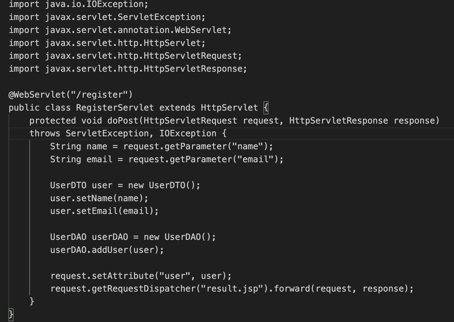 - RegisterServlet이 요청을 받아, 폼 데이터를 읽고 UserDTO 객체를 생성합니다.