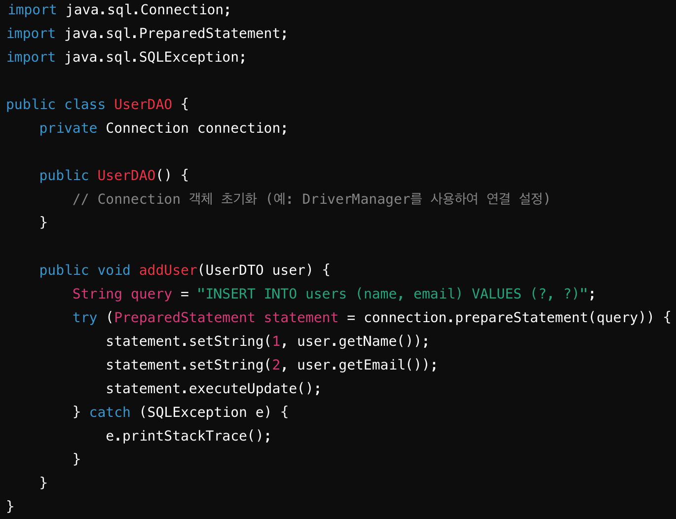 - DAO는 데이터베이스와 연결하고, SQL 쿼리를 실행하며, 결과를 DTO로 변환하여 반환합니다.